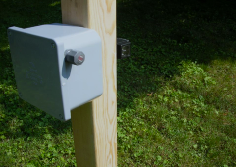Here is a picture of one of the initial prototypes. You can see the laser photo receiver on the left and on the opposite side of the pole is an active powered infrared emitter/receiver combination sensor. The top of the pole had a small solar panel that kept the internals of the system powered.